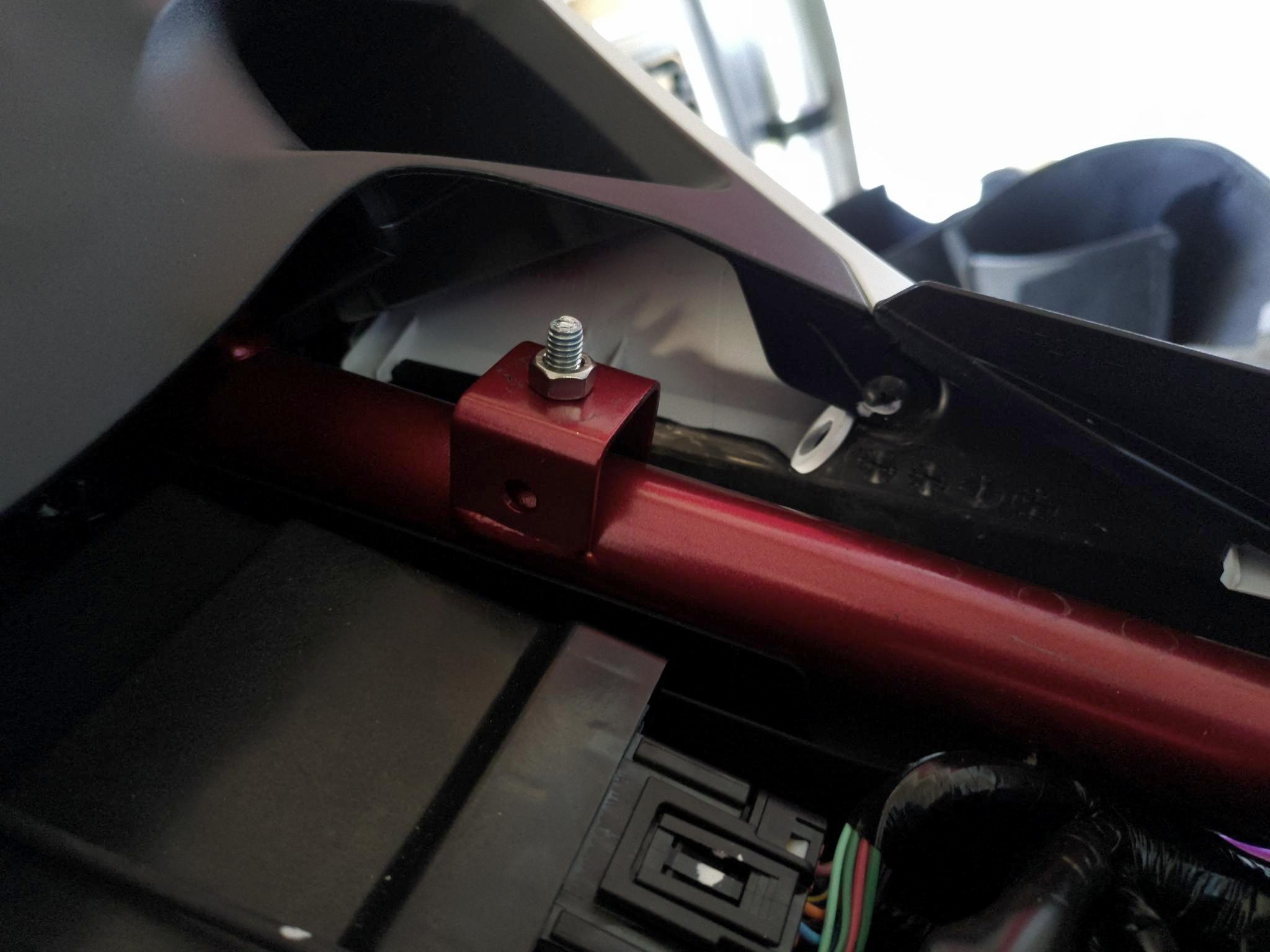 The Corbin bucket uses two metal bars attached to the fiberglass pan to reach the threaded frame locations allowing mounting with two rear bolts. Unfortunately, the two bars are not perfectly fitted and approach the bike frame at an angle. This causes bolts to not be aligned with threads and makes the installation very difficult given tight quarters.
